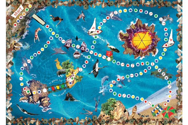 Het spel is een reis door zee op weg naar de coole kikker, die lekker op het strand ligt. Terwijl je stormen trotseert, dwars door de haaien en de krokodillen laveert, over de nijlpaardenbrug springt en het orakel van de vulkaan raadpleegt, geef je antwoord op de vragen van de rode, groene, gele of blauwe kaartjes die door de andere kinderen worden voorgelezen en zo kun je een fiche verdienen.